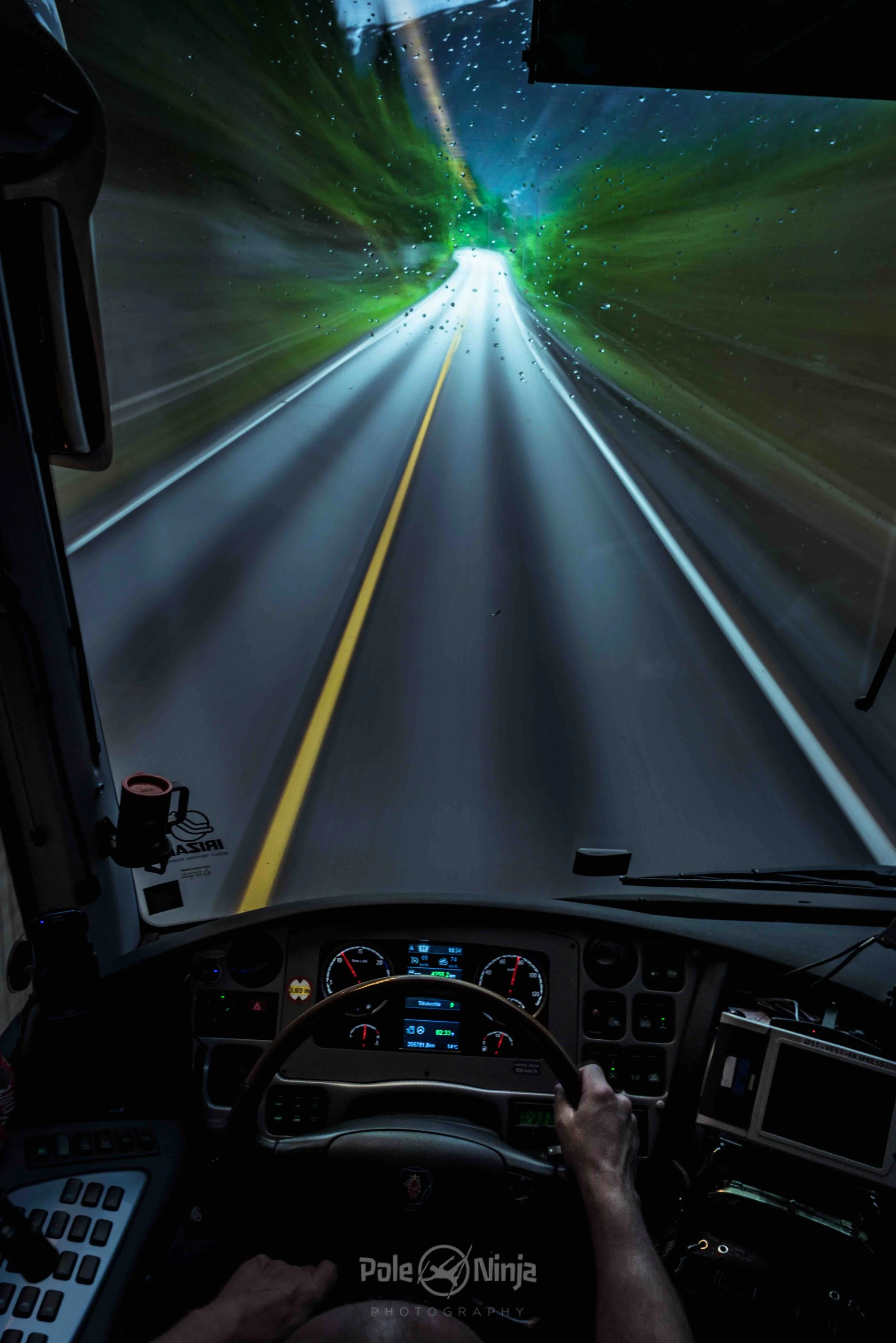 It was taken after we'd entered a tunnel and escaped some sprinkling rain, and we are exiting the tunnel as the shutter is open. That is why it looks brighter in the distance, and you can see the streak of tunnel lights above. The road happened to be perfectly straight, and the driver perfectly still, and the bumps, relatively minor, for the open shutter to collect such unblurred image inside the bus.